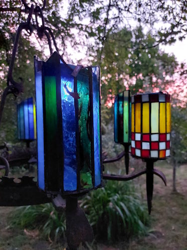 Tuinluster smeedijzer met glas in lood